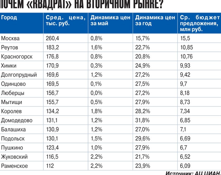 В текущем году чемпионом России по росту цен на готовое жилье стала Московская область. В начале июня в подмосковных городах с населением от 100 тыс. человек 1 «квадрат» в среднем стоил 125 тыс. рублей (+1,1% за май, +19,0% — за год). Если в январе 2021-го в Подмосковье было пять городов с ценами «квадрата» выше 150 тыс. рублей (Реутов, Красногорск, Долгопрудный, Одинцово, Химки), то сейчас к этому списку добавилось еще два города — Люберцы и Мытищи.