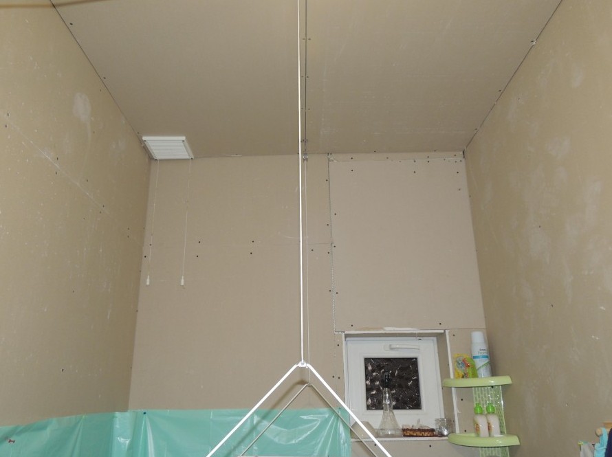 Ванную комнату, она же туалет, не фотографировали, ничего не поменялось, но и плесень не появилась, сами посмотрите. Обыкновенный гипсокартон стойко выдерживает бурные восторги нашего сына во время купания. На пол только положили линолеум и коврики, босиком не холодно ходить. Свисающая конструкция — икеевская сушилка под потолок, по-моему, отличное изобретение, экономящее место. Вообще, ИКЕА у нас по всему дому, дальше увидите. Да-да, мы — нищеброды, но это и так понятно.