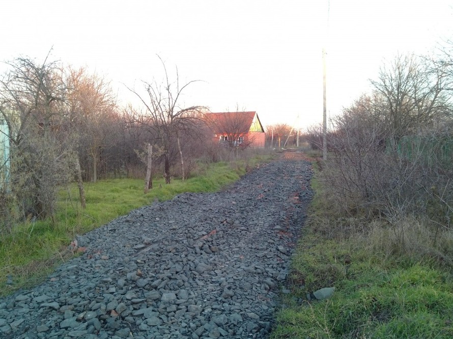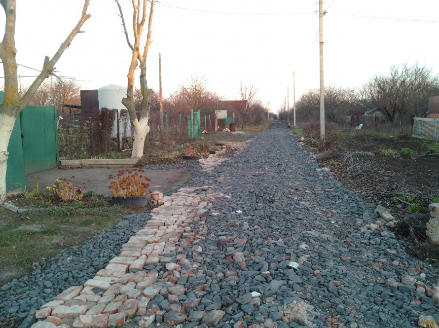 Технология простая: фронтальным погрузчиком разравнивается битый кирпич из расчета один «Камаз» на 50 метров. Далее рассыпается крупный щебень в той же пропорции. Где-то получилось лучше, где-то хуже, но проехать можно теперь везде. Наша улица — скряги, поэтому мы на дороге экономили как могли, даже часть кирпичей уложили вручную.