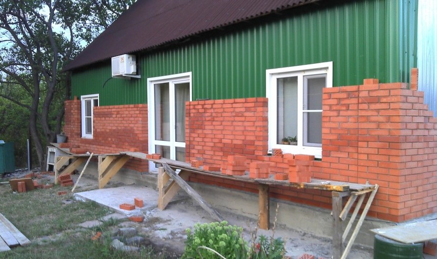 Предвидя многочисленные комментарии к сему действу, можем всех заверить, что сделано это не в целях утепления, укрепления или бог знает чего ещё, только с одним — чтобы привести дом в человеческий вид, самим же приятно глянуть. Сама эта кладка крепится к тому наипрекраснейшему зелёненькому металлопрофилю, который мы не стали снимать, ибо толку нет, а мороки много. Нагрузки никакой кирпич не несёт, от сырости и холода не спасает, если что.