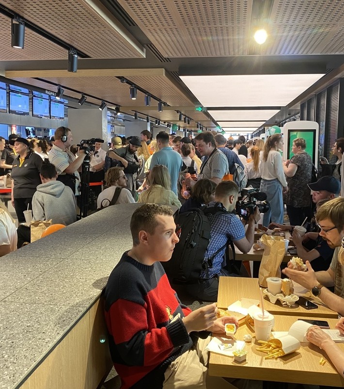В полдень собственник ресторана произнес напутственную речь, разрезал красную ленточку. И граждане ломанулись за бургерами. Запускали посетителей партиями, чтобы не создавать толкучки.