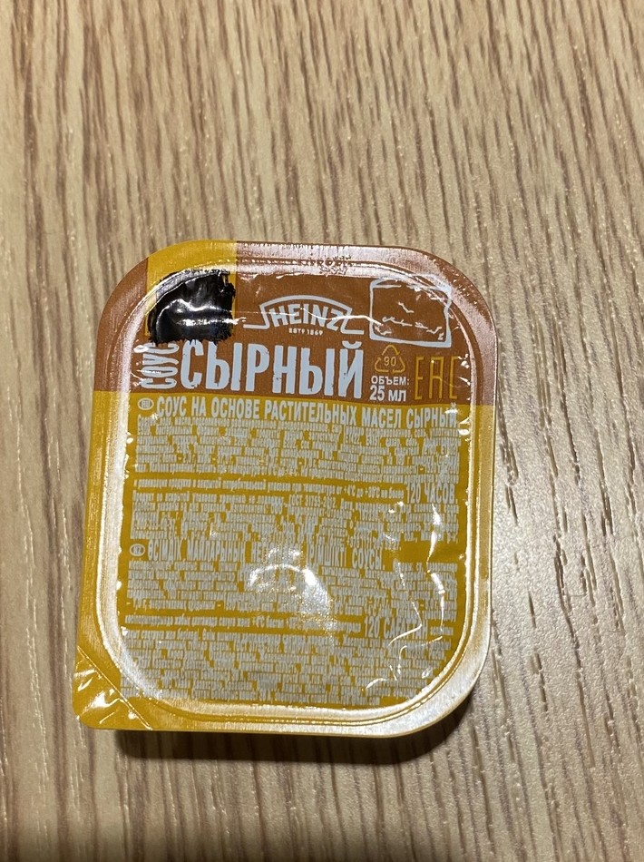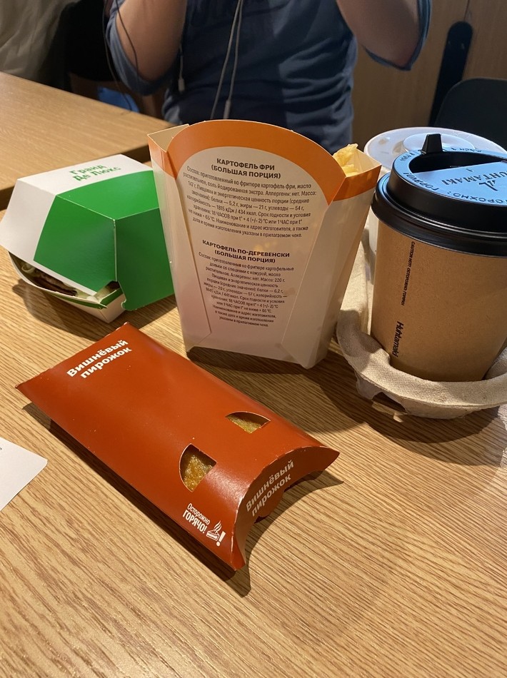 Товар завернули в обычный бумажный пакет без опознавательных знаков. Стаканчики и упаковки для картошки тоже лишились своих цветов. С соусами решили вопрос кардинально – закрасили черным маркером старые логотипы.