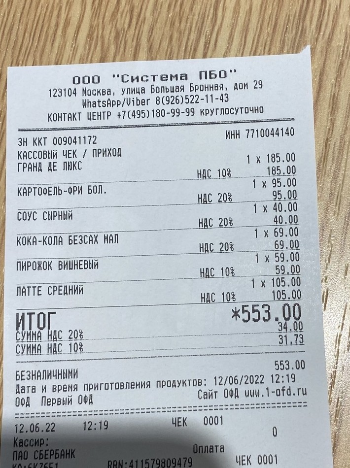 Для пробы я еще взяла латте, картошку-фри, сырный соус и пирожок с вишней. Чек вышел на 553 рубля.