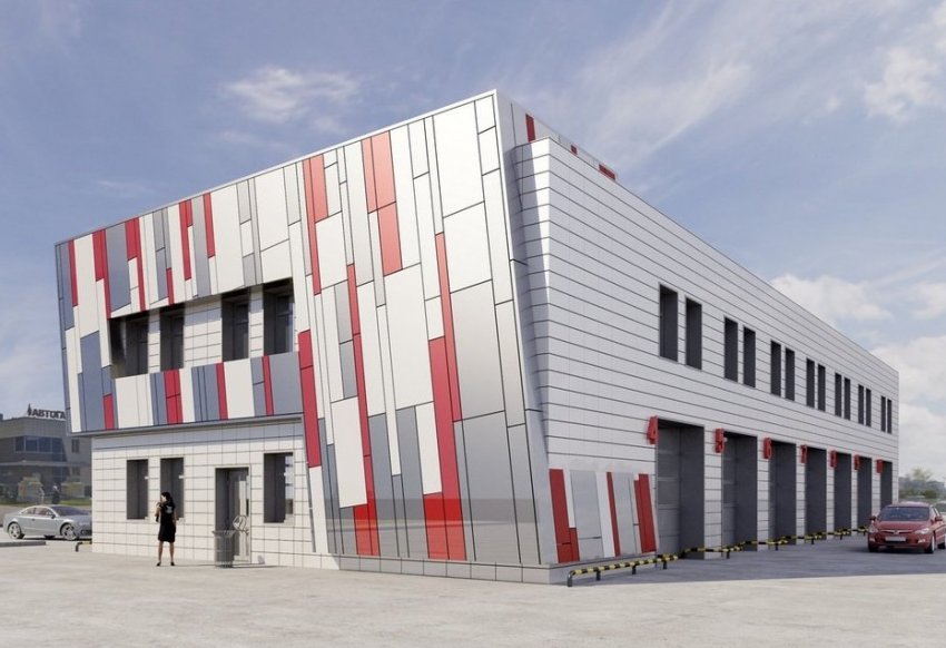Любопытно, что эскизы фасадов универмага, выложенные на сайте проектной организации, не имеют ничего общего с картинками, представленными на информационном стенде у ворот стройки. Судя по всему, застройщик в процессе реализации принял решение сэкономить, и эффектное здание с «ломаным» козырьком и оригинальной отделкой фасада материалами, окрашенными в «экологические цвета» превратилось в банальную «коробку» без архитектурных излишеств в стилистике типовых советских универмагов 60—70-х годов прошлого века.