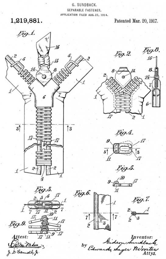 29 апреля 1913 года эмигрировавший в США шведский инженер-электрик Гидеон Сундбек получил патент на изобретение, известное сейчас как застежка-молния. Первый прототип «молнии» был создан еще в 1893 году, однако устройство его было сложным в изготовлении и весьма ненадежным в работе. После нескольких лет поисков Сундбек разработал новый вариант «молнии» и технологию ее производства. Чудо-изобретение состояло из двух текстильных лент, на которых были закреплены идущие в шахматном порядке металлические звенья. Соединение или разъединение половинок выполнялось при помощи замка.