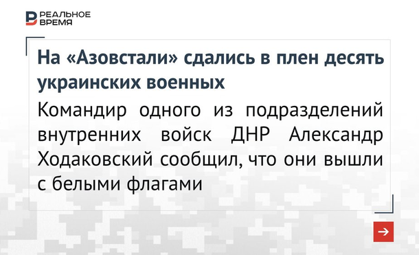 - В Мариуполе около металлургического комбината «Азовсталь» днем 16 мая объявили режим тишины и открыли гуманитарный коридор для эвакуации раненных украинских военнослужащих в больницу в Новоазовске (ДНР) для оказания необходимой помощи. Договоренность об этом достигли сегодня с заблокированными на территории предприятия боевиками, рассказали в Минобороны России.