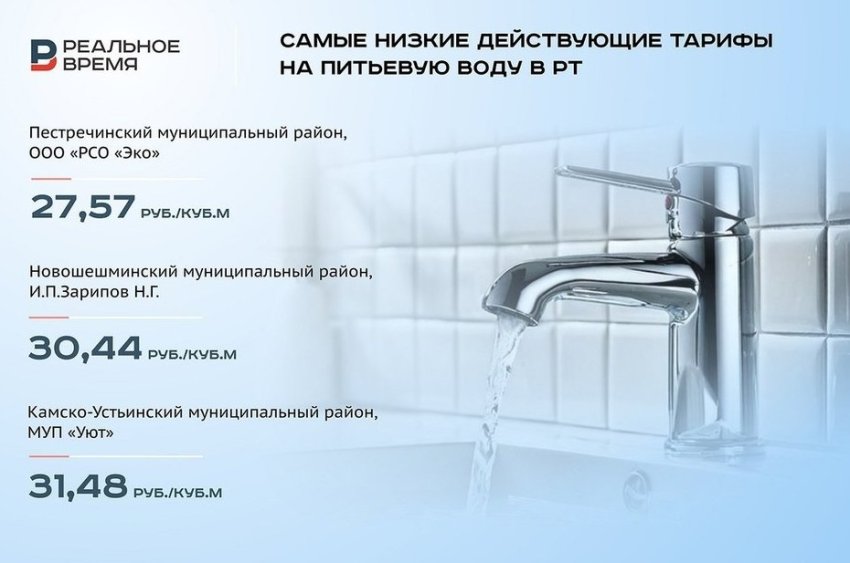 А самая дешевая вода — в Менделеевском муниципальном районе, где лечебно-профилактическому частному учреждению профсоюзов — санаторию «Шифалы Су — Ижминводы» кубометр обходится в 25,16 руб. (в силу малого масштаба потребителя «Реальное время» не включило эти данные в окончательный рейтинг поставщиков дешевой воды), и в Пестречинском муниципальном районе, где потребители, которых обслуживает ООО «РСО «Эко», платят 27,57 руб./куб. метр.