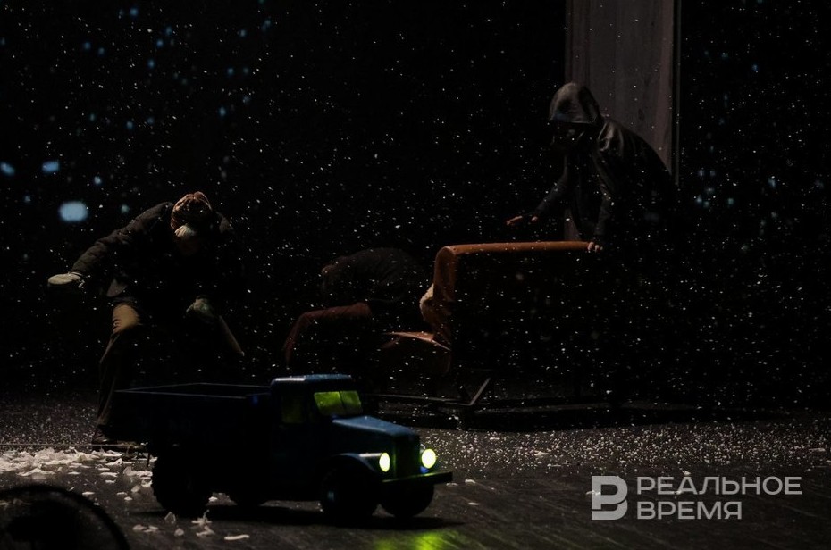 У Заббарова спектакль начинается с их встречи: Ильяс вытягивает заглохшую машину Байтимера. Метель на экранах (основа сценографии), шум, крики. Появляется главный реквизит спектакля: диван, символизирующий салон грузовика. Как шутит один из водителей, ничем они не отличаются от собаки: едят из миски, живут и работают в ящике, да еще и хозяин есть.