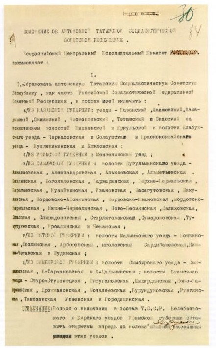 Спустя 5 лет после провозглашения ТАССР, в 1925 году, на второй сессии Центрального Исполнительного Комитета республики был принят проект ее первой Конституции. Документ включал в себя пять разделов и закреплял существующий на тот момент территориальный состав Татарии — 12 кантонов. ТАССР провозглашалась автономным социалистическим государством рабочих и крестьян, входившим на началах федерации в состав РСФСР. В 1926 году проект Конституции одобрил Совет ТАССР, но ВЦИК и Съезд Советов РСФСР не утвердили его.