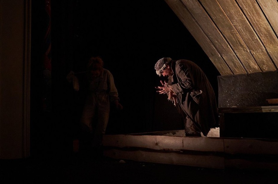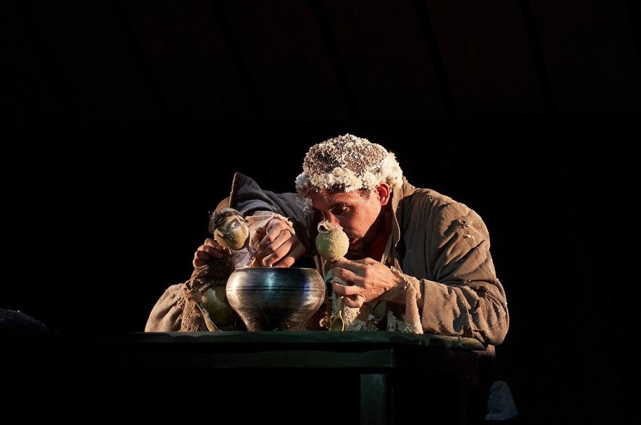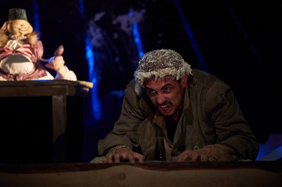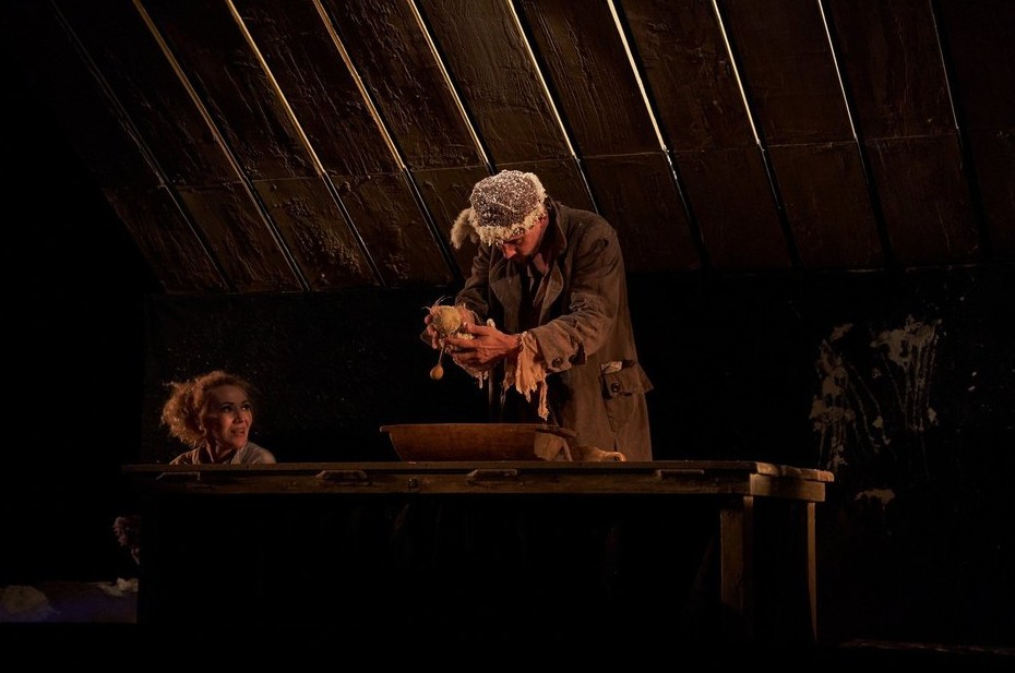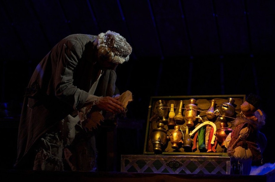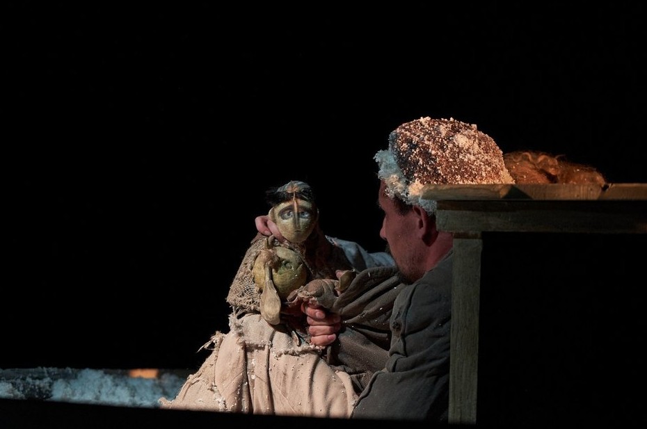 А люди здесь такие, что куклы на их фоне выглядят человечнее. Актеров двое. Дилюс Хузиахметов играет престарелого отца семейства — у него жена, сын Зайни и дочь Нафиса. Альбина Шагалиева — подлинный мастер перевоплощения и главное украшение спектакля: она озвучивает и оживляет по две куклы сразу, переключаясь с одной роли на другую. А еще один персонаж — сам Голод, хитрый, коварный, который мучает и испытывает Гарая.