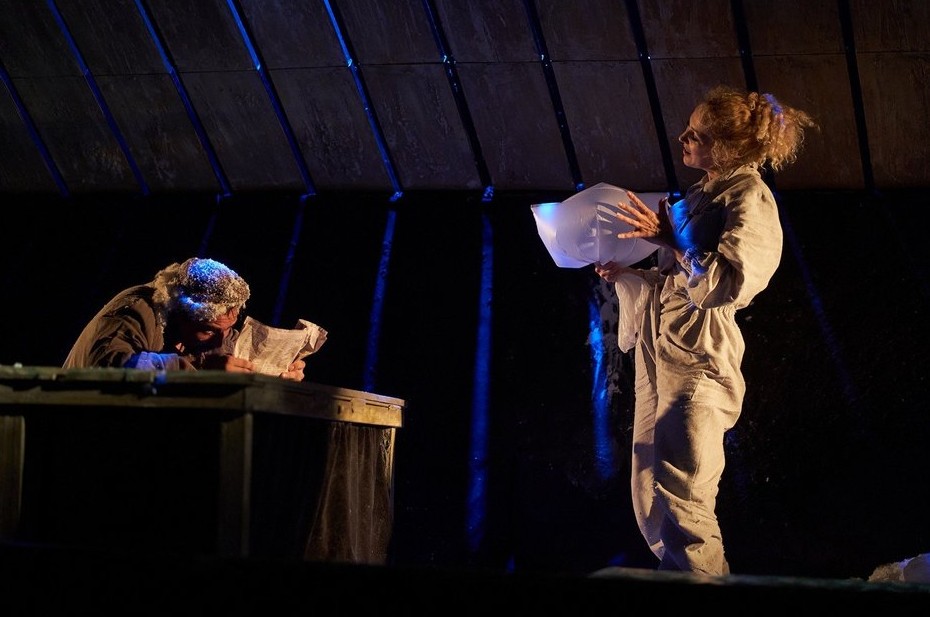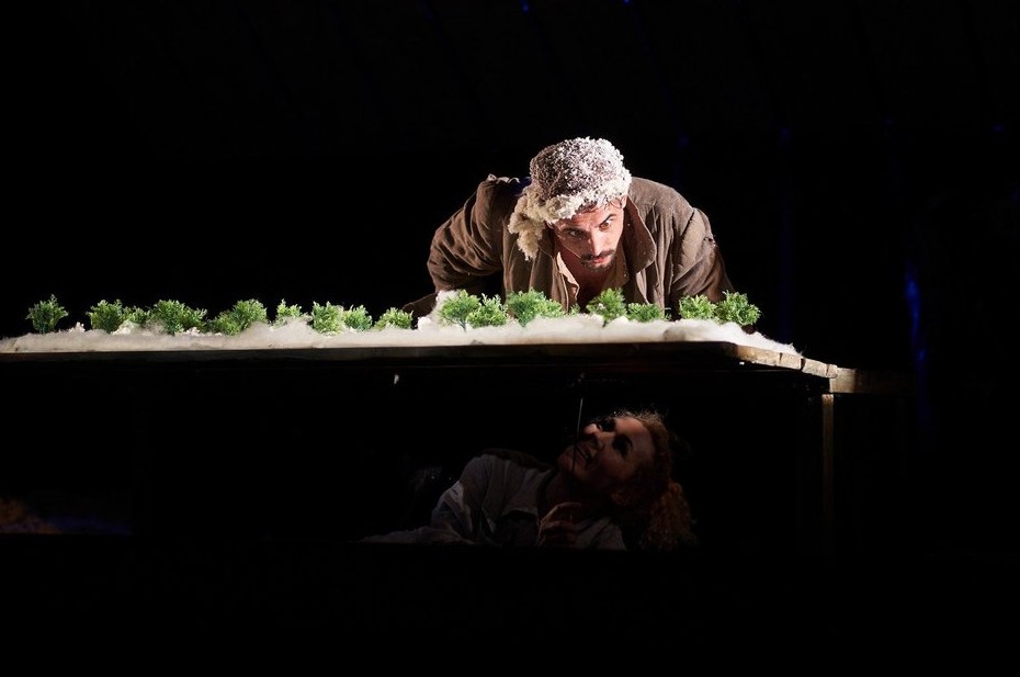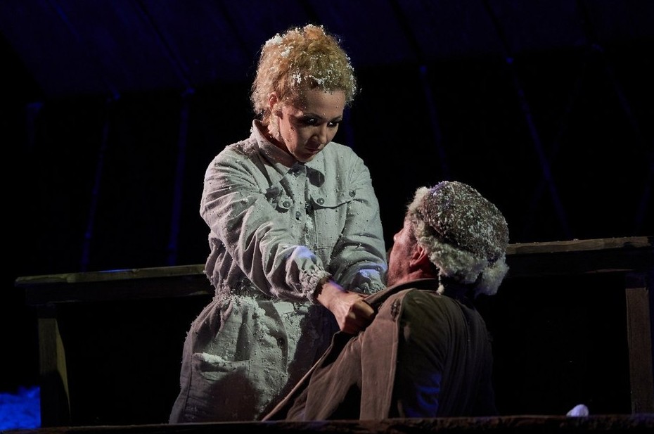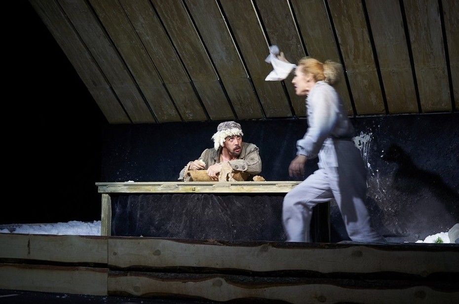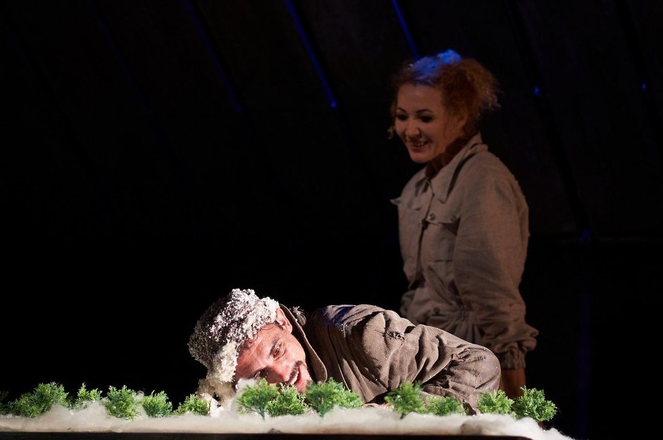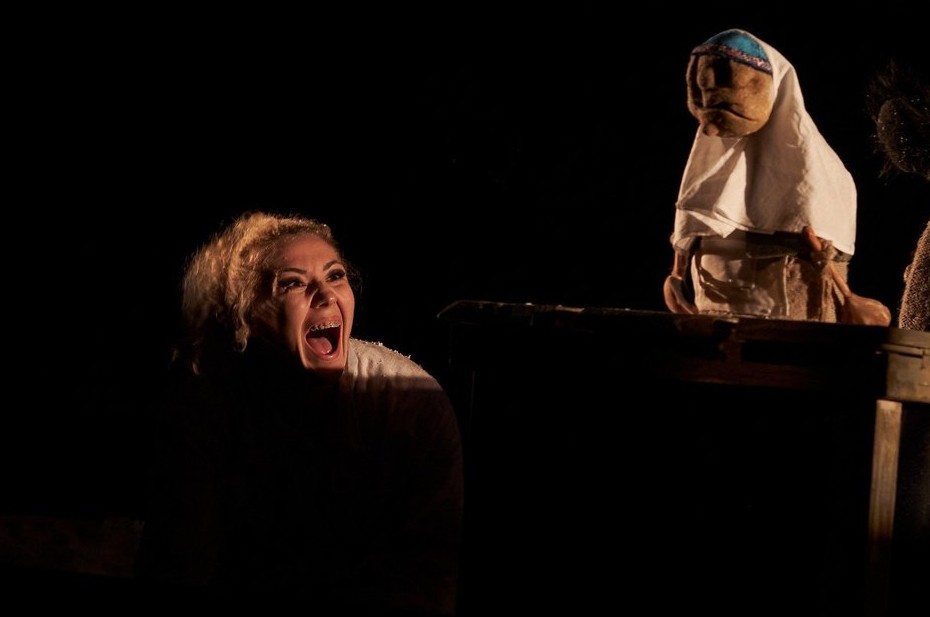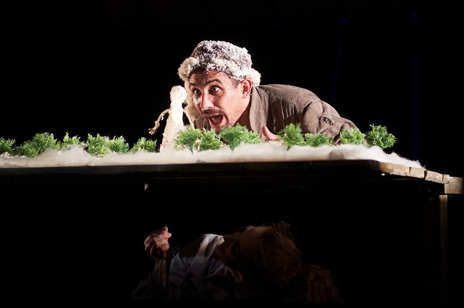 А люди здесь такие, что куклы на их фоне выглядят человечнее. Актеров двое. Дилюс Хузиахметов играет престарелого отца семейства — у него жена, сын Зайни и дочь Нафиса. Альбина Шагалиева — подлинный мастер перевоплощения и главное украшение спектакля: она озвучивает и оживляет по две куклы сразу, переключаясь с одной роли на другую. А еще один персонаж — сам Голод, хитрый, коварный, который мучает и испытывает Гарая.