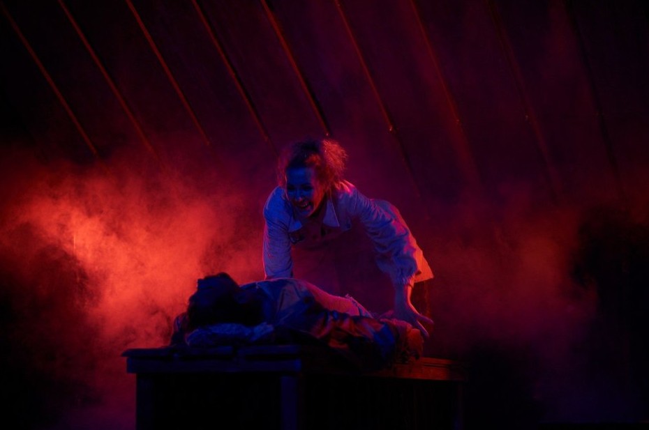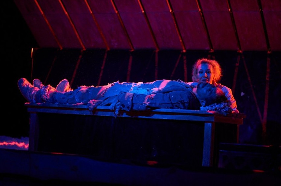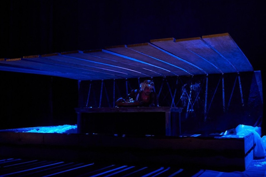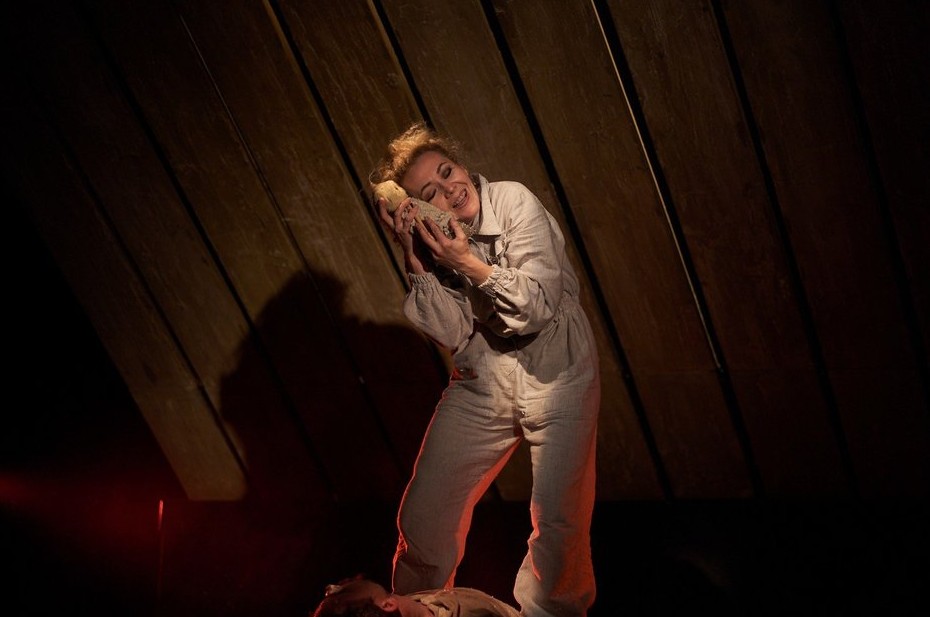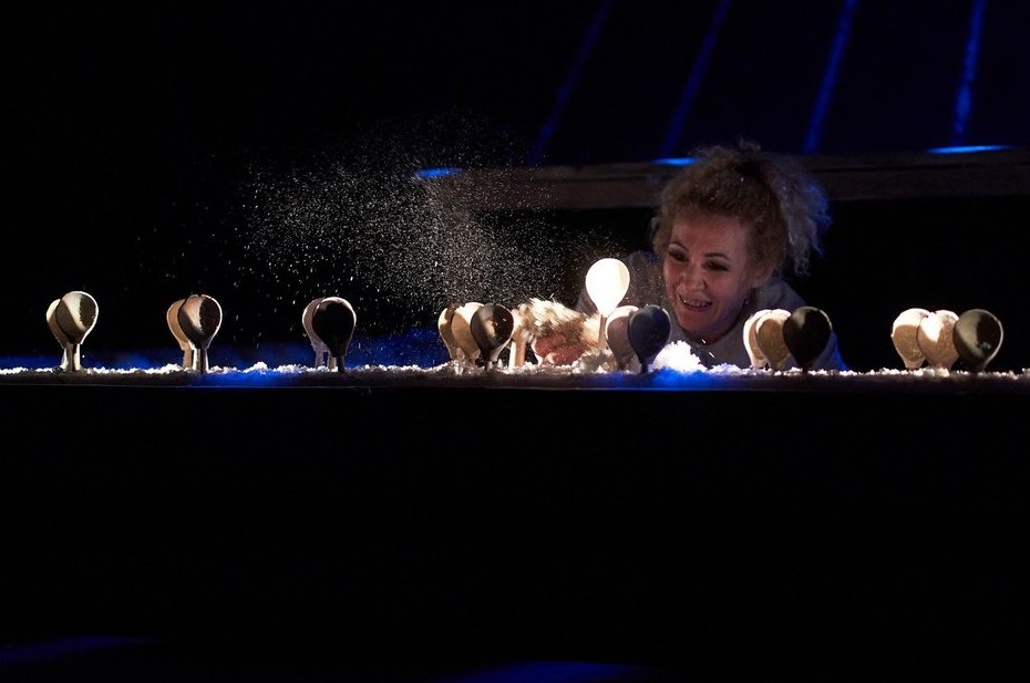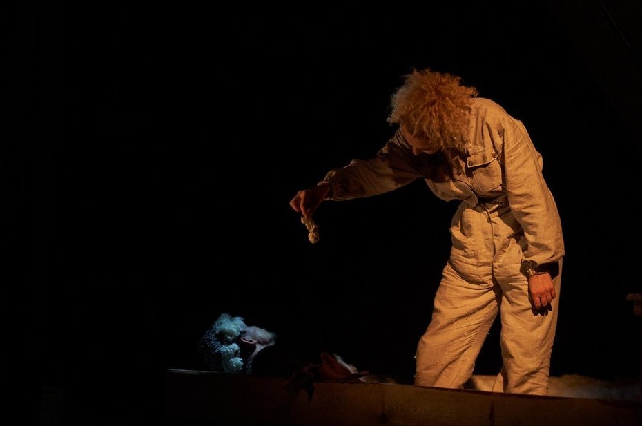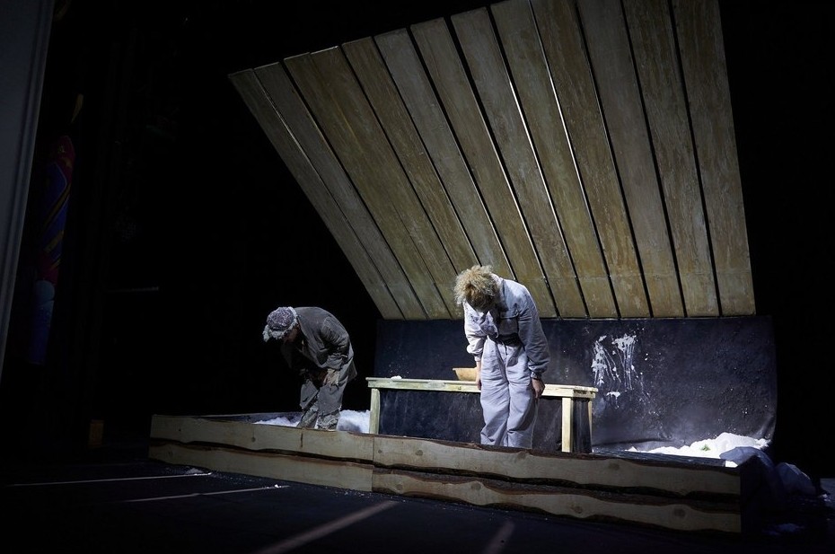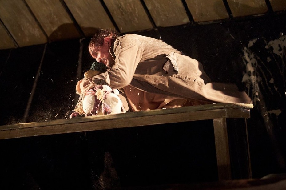 В первую очередь этот спектакль о таланте актеров. Они постоянно в движении, то играют сами, то работают с куклами (а бывает, и сшибают их в ярости с мини-сцены, похожей на гроб), то трансформируют декорации, то отчаянно жуют все, что попадется под руку. Четкий темп — с ними вместе возносится ввысь и бросается оземь струнный квартет, играющий музыку Эльмира Низамова в духе Софии Губайдуллиной.