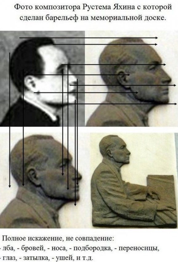 В обращении Байгильдеев пишет, что 25 апреля 2011 года он обращался с письмом по установке памятника и мемориального комплекса композитору Рустему Яхину на Ново-татарском кладбище — «в связи с искажением лица на барельефе могильной плиты. Ноты на могильной плите так же изображены с ошибками» (орфография и пунктуация автора сохранены — прим. ред.). Еще одно письмо касалось мемориальной доски Яхину по адресу: ул. Татарстан, д. 7 (здесь он жил с 1978 по 1993 годы): «Причина — на барельефе лицо композитора грубо искажено». В доказательство выслал примеры искажений.