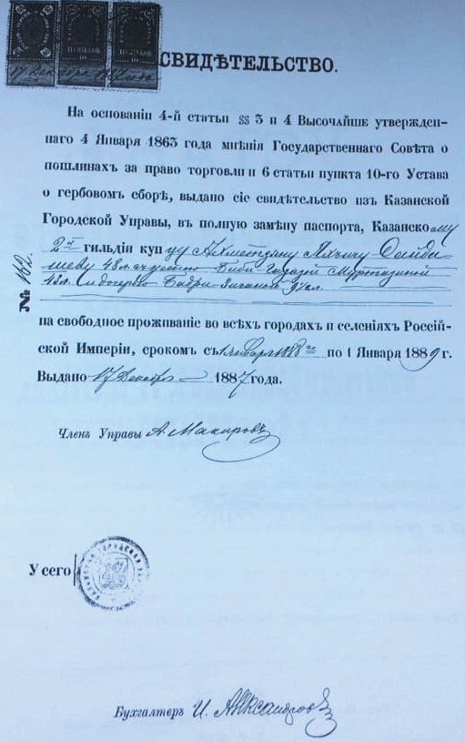 В то время казанским купцам, которые достигали определенного положения, прежний паспорт заменялся на новый, который давал право, на основании 4-й статьи параграфов 3 и 4 Высочайше утвержденного 4 января 1863 года мнения Государственного Совета о пошлинах за право торговли и статьи 6 пункта 10 Устава о гербовом сборе, свободного проживания во всех городах и селениях Российской империи. Так, согласно свидетельству, выданному 17 декабря 1887 года Казанской городской управой, А.Я. Сайдашев с женой и дочерью Бадри-Зиганой получает новый паспорт сроком на один год с правом дальнейшей пролонгации. Также в последующем, а именно в 1911 году, согласно Списку мусульман, которым были выданы заграничные паспорта, Мухаметзян Ахметзянович Сайдашев получает новый документ.