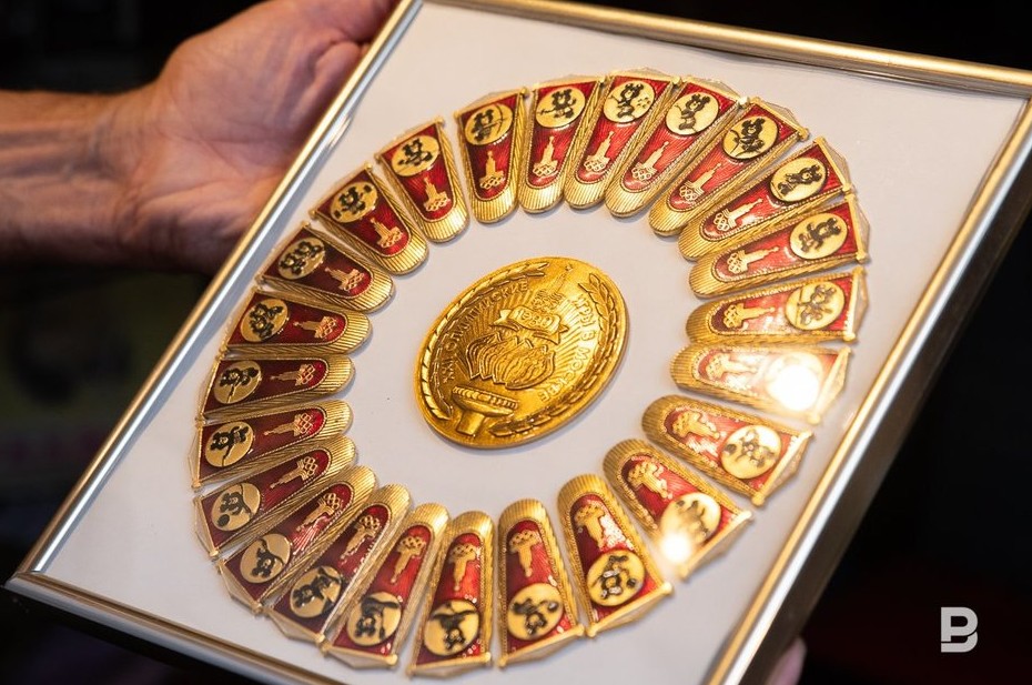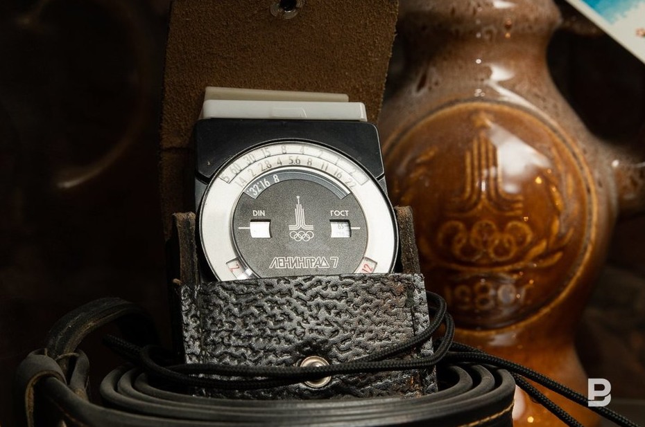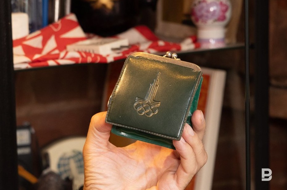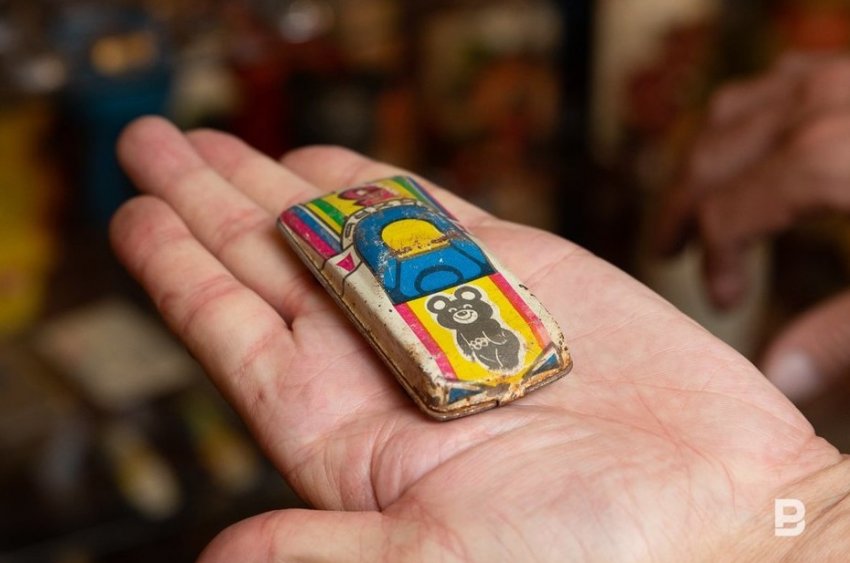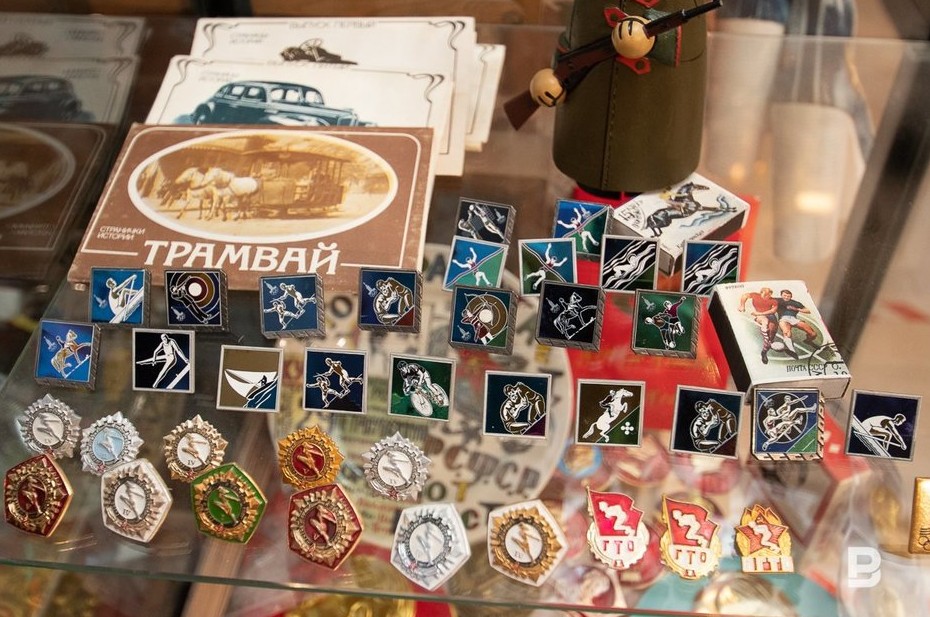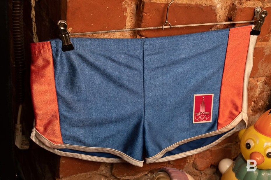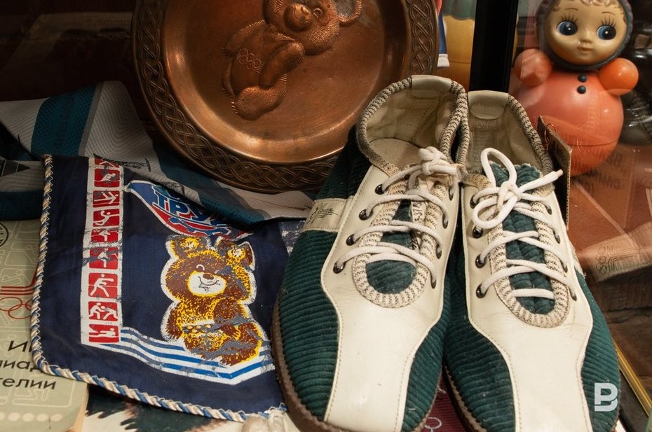 Один из небанальных экспонатов — резиновый придверный коврик с олимпийскими кольцами. При взгляде на него сразу понимаешь: этой вещи не может быть меньше 40 лет, уж очень много ног по нему прошлись. Но — кольца! Валиахметов рассказывает историю его приобретения:
