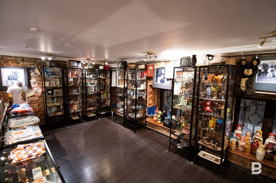 Мы видим редкий экспонат: журнал «Новые товары» 1978 года с разделом «Гостям Олимпиады». Если ему верить, то гостям Олимпиады предлагались, к примеру, «яркие платки», «добротные мужские и женские костюмы», «монофоническая радиола», «радиоаппаратура производства ГДР». Директор музея рассказывает, что это был своего рода каталог того, что якобы можно было приобрести в советских магазинах. Разумеется, «радиоаппаратура производства ГДР» во второй половине семидесятых в СССР, конечно, продавалась, но далеко не всем. Впрочем, не будем о грустном, перейдем к мишкам.