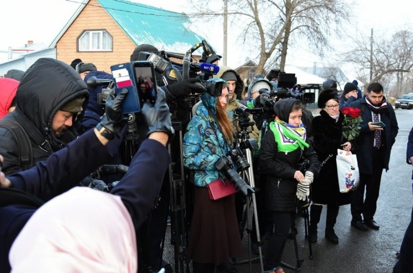 После торжественного снятия белой ткани с таблички все пошли фотографироваться на крыльце исламского университета. У доски остались лишь родственники — Гиндуллина и Валеев, которые молча положили цветы под табличкой.