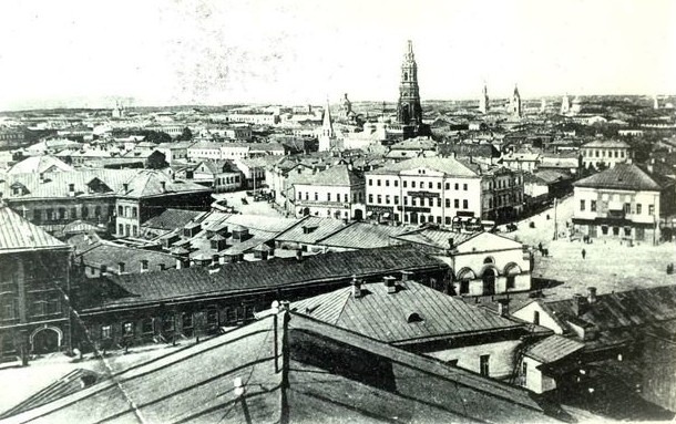 Внимательный взгляд на фотографию Рыбнорядской площади позволяет заметить на месте нынешнего красивого дома 13 по ул. Пушкина небольшой двухэтажный дом и лавки слева от него.