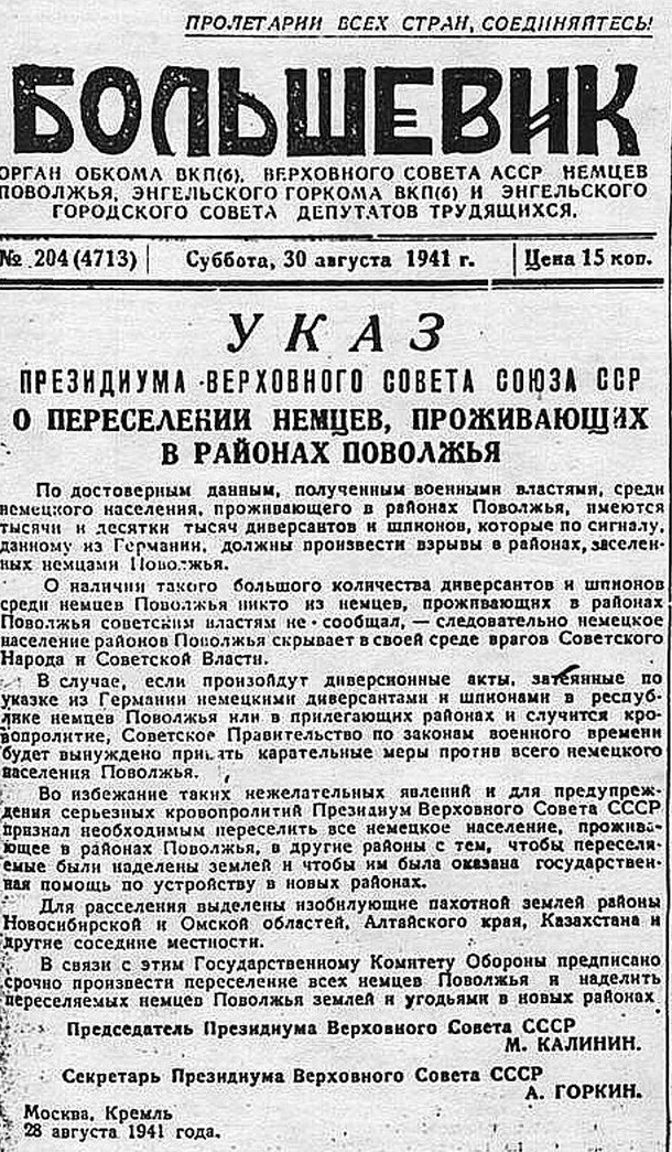 Указом от 28 августа 1941 года полмиллиона поволжских немцев были отправлены в Среднюю Азию и Сибирь. В отличие от других депортированных народов, немцам так и не позволили вернуться на свою землю в Поволжье, и спустя годы для большинства из них новым домом стала Германия.