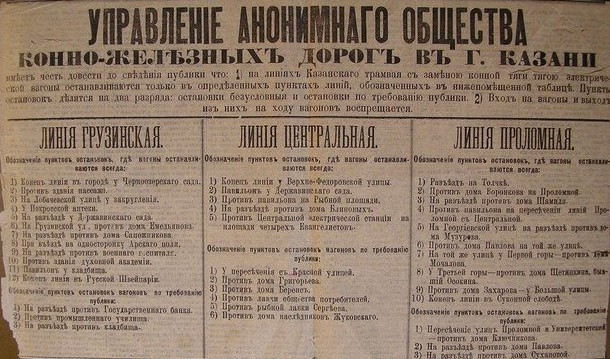 Передо мной еще один интереснейший документ той эпохи. Это разъяснение широкой публике порядка пользования новым видом общественного транспорта — электрическим трамваем, сменившим вагоны на конной тяге: «Управление Анонимного общества конно-железных дорог в городе Казани имеет честь довести до сведения публики, что на линиях Казанского трамвая с заменой конной тяги на электрическую вагоны останавливаются только в определенных пунктах линий, обозначенных в нижепомещенной таблице. Пункты остановок делятся на два разряда: остановки безусловные и остановки по требованию публики. Вход в вагоны и выход из них на ходу воспрещается».