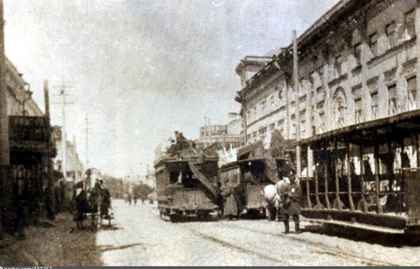 Кстати, на фото в объектив попали сразу два коночных вагона с «империалом» — вторым этажом для состоятельных пассажиров. Точная копия такого «империального» вагона сегодня является экспонатом музея трамвая под открытым небом в конце Петербургской улицы, где кроме новоделов есть и настоящий трамвай 1930-х годов, более известный среди горожан как трамвай И. Кабушкина. Впрочем, как сказал бы ведущий одной из популярных телепередач: «это уже совсем другая история»…