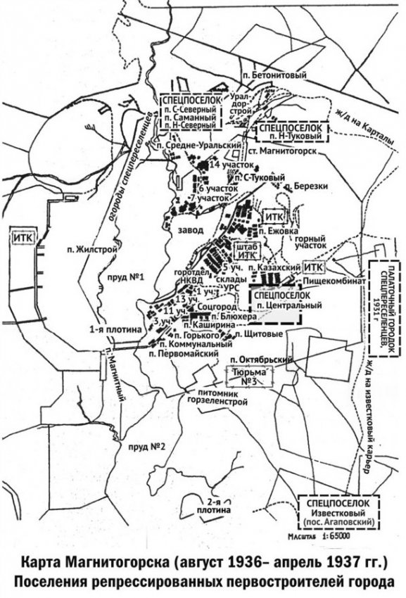 Данная карта в известной мере является иллюстрацией того факта, что Магнитка первоначально в значительной мере строилась людьми подневольного труда. В ее основу положена план-схема Магнитогорска, сохранившаяся в городском архиве. Можно достаточно точно датировать время создания архивной карты, поскольку на ней обозначены поселки Н. Каширина и В. Блюхера, получившие эти названия, согласно протоколу №5 заседания президиума Магнитогорского горсовета от 5 августа 1936 года. В августе 1937-го года командарм Николай Каширин был репрессирован, и, следовательно, поселок был сразу же переименован. Кроме того, очертания берегов заводского пруда обозначены на плане-схеме города еще до их изменения после пуска второй плотины в апреле 1937 года. Поэтому создание этого исторического документа можно датировать отрезком: август 1936 — апрель 1937 годов.
