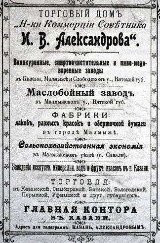 Почти 10 лет варил в Казани пиво Торговый дом «Наследники И.В. Александрова». Богатая коллекция фонда 318 Национального архива РТ мало изучена исследователями. Вятский купец и промышленник, Иван Васильевич Александров развернул широкую деятельность в области выращивания ржи, винокурения и пивоварения. Первое александровское пиво было выпущено еще в 1870 году в городе Слободском Вятской губернии. Через 23 года дело Александрова пришло в Казань в виде Торгового дома «Наследники И.В. Александрова». Петр и Иван, сыновья скончавшегося в 1893 году Ивана Васильевича Александрова, основали торговый дом, объединивший многочисленные предприятия в Казанской и Вятской губерниях. В Казани Александровы купили часть мощностей у Петцольдов.
