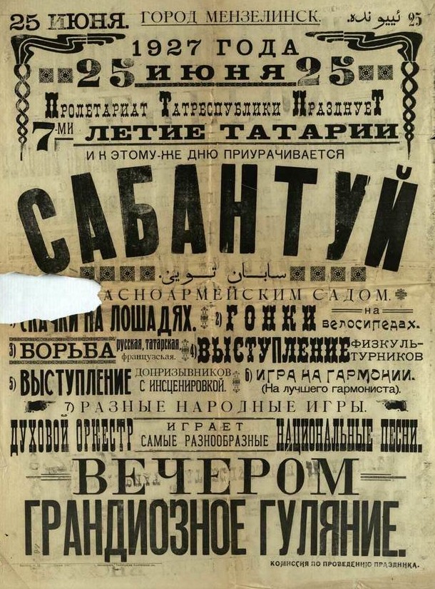 P.S. Праздник татар-кочевников — Джиен — к сожалению, оказался уничтожен большевиками и забыт всего лишь за два-три поколения. Уничтожен древний татарский праздник, который до 1920 годов был гораздо более значимым и весомым в жизни и культуре татар, чем Сабантуй. Причем для уничтожения Джиена, с сильной исламской составляющей, был использован именно Сабантуй, с его языческим происхождением. Так была прекращена практика мусульманизированного Джиена, длившегося несколько дней, когда после посевной и до сенокоса люди собирались в разных селах, могли неспешно вести исламские и антисоветские разговоры, отдыхали, расслаблялись, общались, знакомились, договаривались о свадьбах.