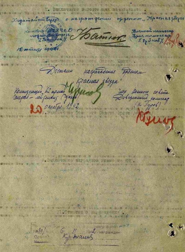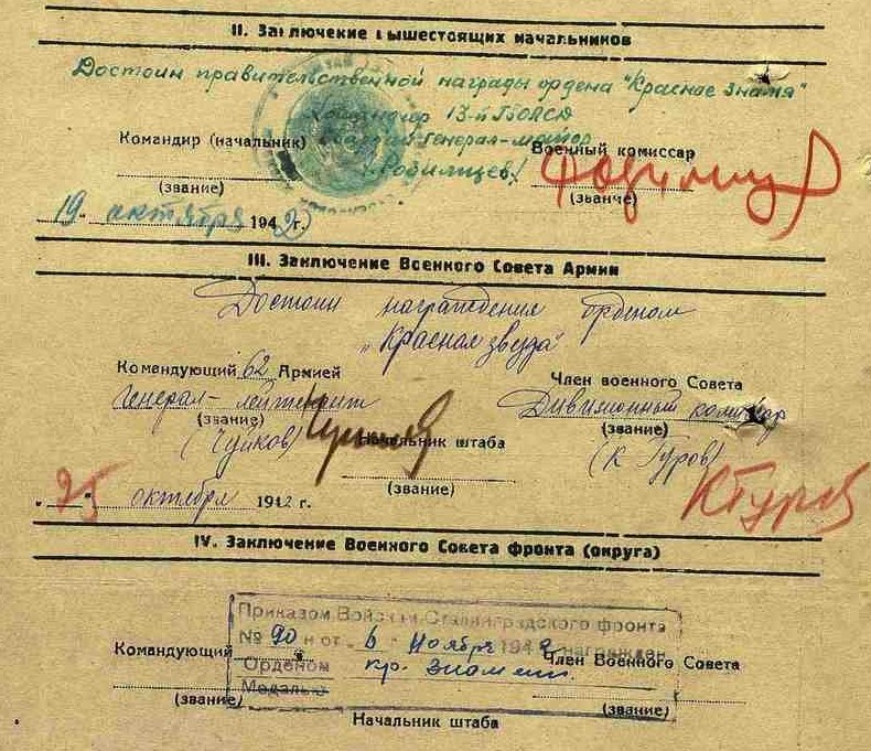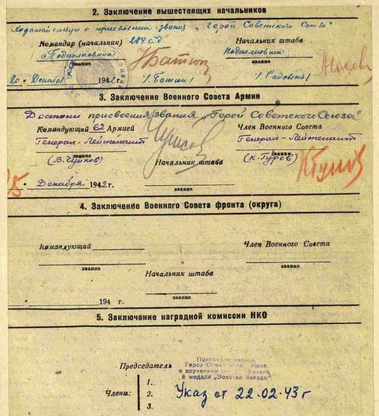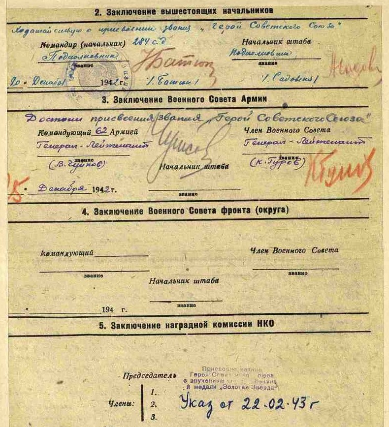 Достоин награждения орденом Красная Звезда — командующий 62 армией генерал-лейтенант В. Чуйков.