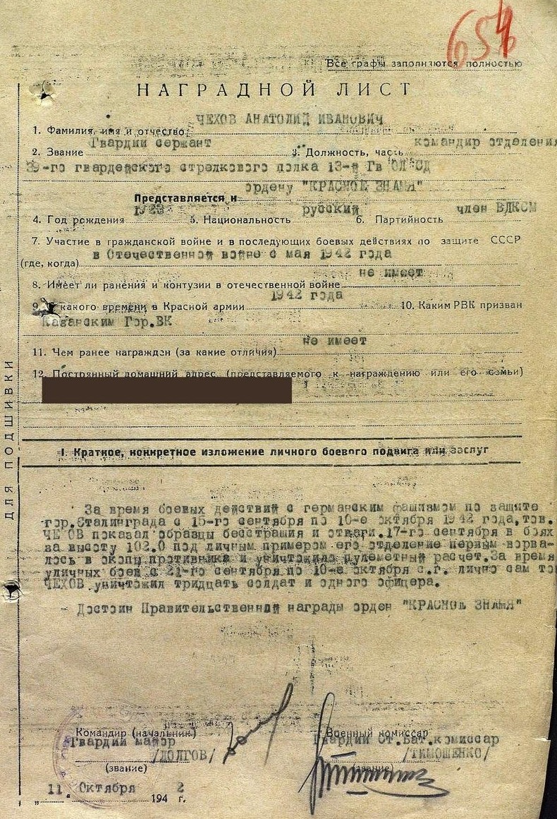 За время уличных боев с 21 сентября по 10 октября 1942 года лично тов. Чехов уничтожил 30 солдат и одного офицера».