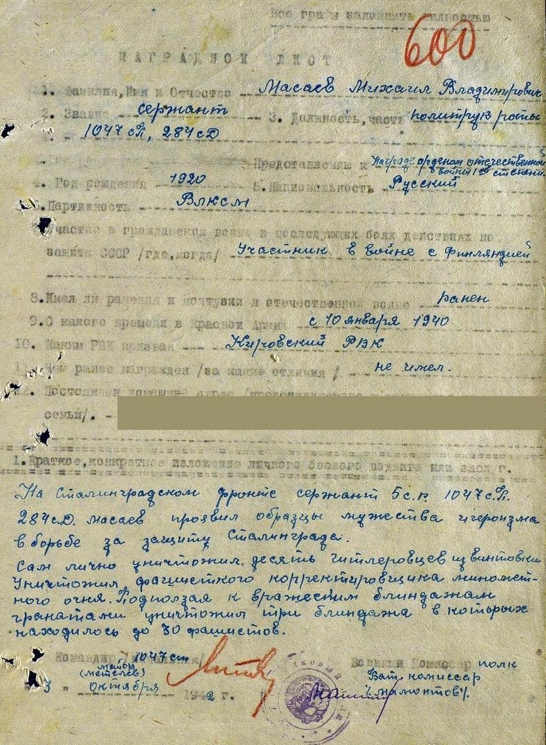 «Масаев Михаил Владимирович, 1920 года рождения, мобилизован Кировским РВК г. Казани 10 января 1940 года. Участник советско-финской войны. Сержант, политрук роты 1047 стрелкового полка 284 стрелковой дивизии. Ранен.