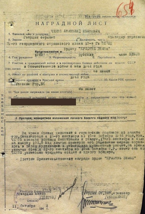 За время боевых действий по защите г. Сталинграда с 15 сентября по 10 октября 1942 года гвардии сержант Чехов показал образцы бесстрашия и отваги.