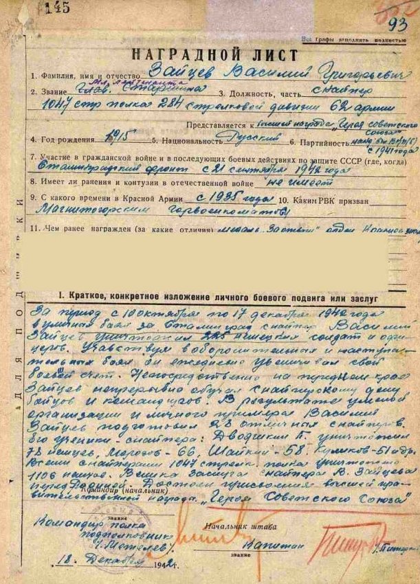 «Зайцев Василий Григорьевич, 1915 года рождения, мобилизован Магнитогорским горвоенкоматом в 1935 году. На Сталинградском фронте с 21 сентября 1942 года. Младший лейтенант, снайпер 1047 стрелкового полка 284 стрелковой дивизии.