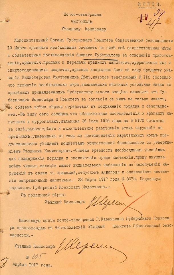 Управляющий акцизными сборами Казанской губернии сообщал, что некоторыми сельскими и волостными комиссарами были своеобразно поняты данные им инструкции по борьбе с распространением спиртных напитков. Они не только не предпринимали никаких мер к пресечению производства и продажи алкоголя, но и поощряли торговлю, устанавливали твердые цены на спиртное и пытались таким образом предупредить спекуляцию.
