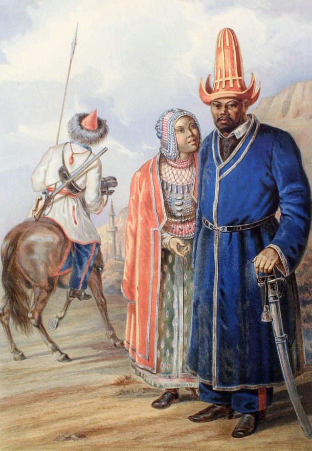 Они носят бороду, бреют голову и покрывают оную нередко богато вязаной шапочкой; она, в отличие от головных уборов других народов, подобна кеглю, но не очень востро кверху сведена. Шапки их окантованы узкой полоской меха.