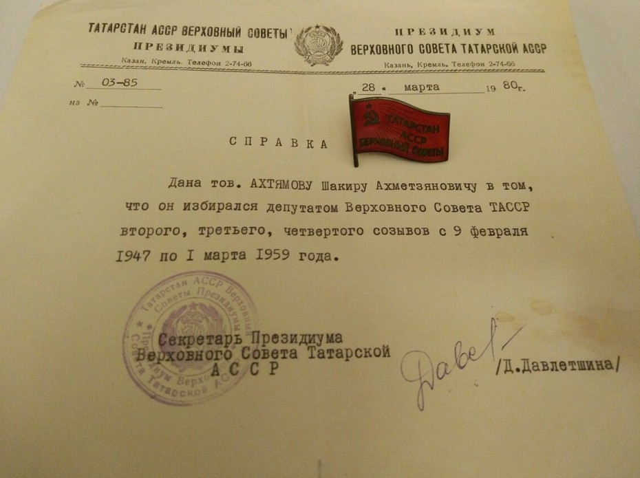 Дед участвовал в XIX съезде партии большевиков в Москве, избирался депутатом Верховного совета ТАССР, работал заместителем председателя президиума Верховного совета. Более 20 лет руководил одним из районов республики. Награжден орденами и медалями, включая ордена Ленина и Трудового Красного Знамени.