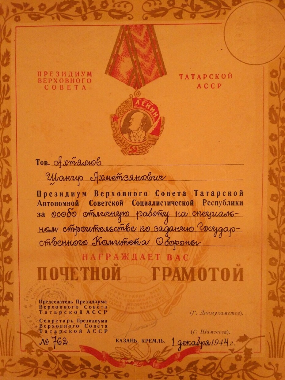 Дед Ахтямов Шакир Ахметзянович участвовал в создании резино-технического производства в Ярославле.