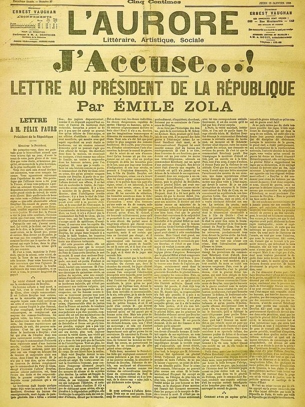 13 января 1898 года французский писатель Эмиль Золя послал открытое письмо (известное под названием «Я обвиняю») французскому правительству по поводу дела Дрейфуса. В нем он обвинил власти в антисемитизме и противозаконном заключении в тюрьму Альфреда Дрейфуса. Золя указывал на предвзятость военного суда и на отсутствие серьезных улик. Офицер французского генерального штаба, еврей по происхождению, обвинялся в шпионаже в пользу Германской империи. Письмо напечатали на первой полосе газеты. В связи с этой публикацией Золя обвинили в клевете и осудили. Ему пришлось бежать в Англию.