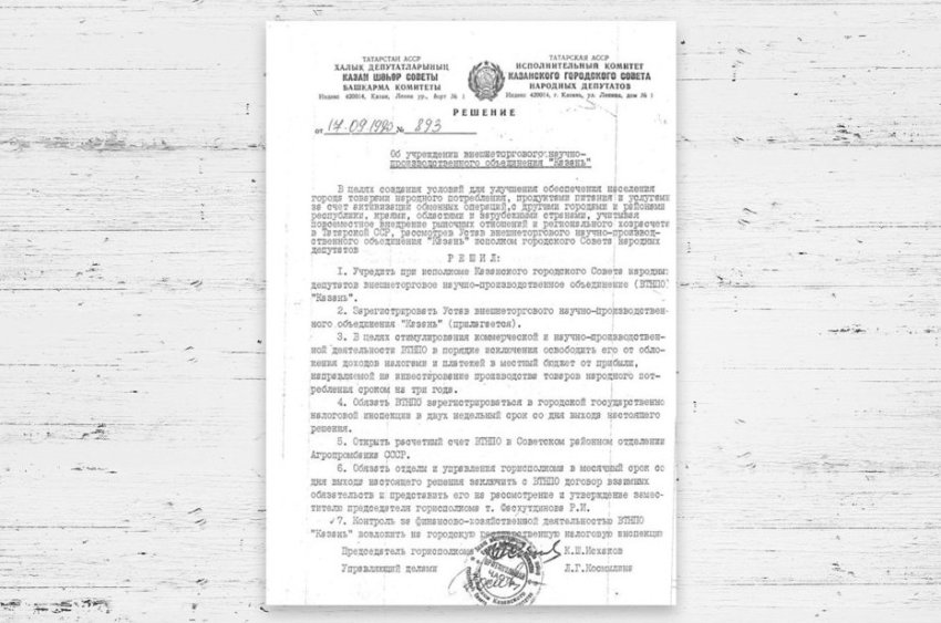 В эпоху катастрофического дефицита всего и вся, пока одни хватались за голову, не зная, что делать в разразившемся вокруг хаосе, другие прилагали все силы для решения текущих проблем. С идеей о создании структуры, готовой взять на себя решение широкого спектра задач, Альберт Шигабутдинов отправился к Камилю Исхакову — председателю исполнительного комитета Казани (сегодня соответствует должности мэра, — прим. ред.). Инициатива нашла одобрение. Так в Татарстане было основано ВТНПО «Казань» (внешнеторговое научно-производственное объединение «Казань» — прим. ред.).