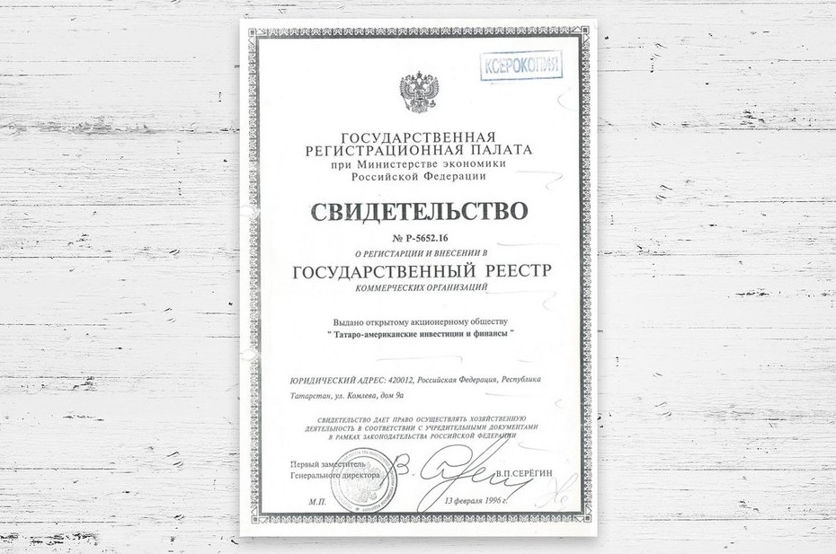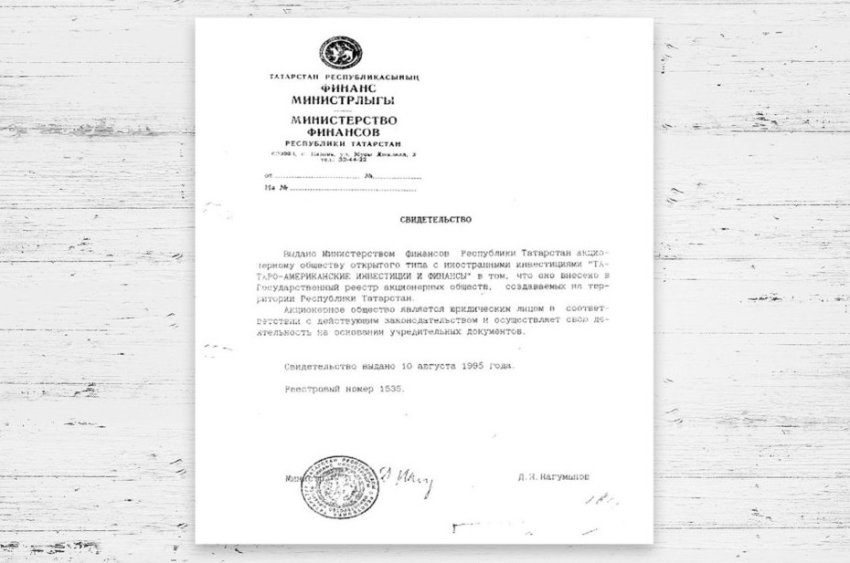 10 августа 1995 года ТАИФ был внесен в Госреестр акционерных обществ, создаваемых на территории Республики Татарстан. В феврале 1996 года компанией было получено свидетельство о регистрации и включении в Госреестр коммерческих организаций Минэкономики РФ.