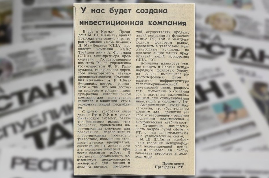 «11 апреля в Кремле президент М.Ш. Шаймиев принял председателя совета директоров компании «Ком-Лиз инк.» Д. Мак-Кенлиса (США), президента компании «НКС Трейдинг инк.» А.З. Фридмана (США), вице-премьера, председателя Государственного комитета РТ по управлению госимуществом Ф.Р. Газизуллина, генерального директора Внешнеторгового научно-производственного объединения «Казань» А.К. Шигабутдинова, которые рассказали о том, что они достигли согласия о создании международной инвестиционной компании для привлечения капитала и вложения его в экономику нашей республики. С целью ускорения интеграции РТ и Российской Федерации в мировую финансовую систему, развития фондового рынка, привлечения инвестиционных ресурсов для реализации перспективных инвестиционных проектов в Татарстане, повышения стоимости активов предприятий, обеспечения их ликвидности эта компания намерена провести большую работу. В частности, организовать независимую международную экспертизу для оценки и анализа активов предприятий, осуществлять продажу акций компании на фондовом рынке, проводить в Татарстане международные аукционы по продаже акций наших предприятий, акций корпораций США, ЕС. Компания планирует также создать в Казани международную фондовую биржу на основе имеющихся радиотелефонных фирм — развитую инфраструктуру телекоммуникационной и спутниковой связи, разработать положение о создании зон с льготным налогообложением для стимулирования инвестиций в экономику РТ. Американские гости подчеркнули, что убедительным доводом для принятия такого ответственного решения послужили политическая и экономическая стабильность в Татарстане, компетентность кадров этой сферы в РТ, о чем свидетельствуют уже установленные связи. М.Ш. Шаймиев одобрил идею создания международной инвестиционной компании и пожелал ей скорее завоевать авторитет в деловом мире», — такое сообщение появилось 12 апреля 1995 года на страницах газеты «Республика Татарстан».