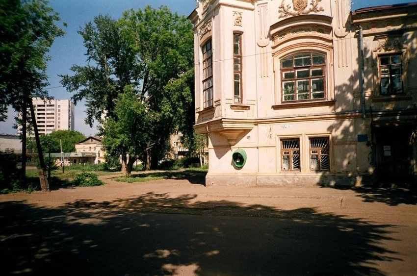 Перенесемся из лета в теплую зиму. Повернем направо и встанем спиной к кинотеатру Тукая. Здесь у современника могут возникнуть проблемы с узнаванием места. Кирпичное здание позади — это часть кондитерской фабрики. Здесь до сих пор можно найти соответствующие указания на табличках внутри, хотя теперь это и автомастерские, и танцевальные кружки, и кафе с баром. А ранее располагался мыловаренный завод Утягановых.