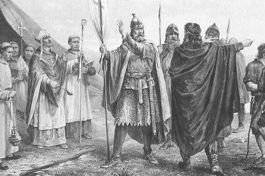 Явившись на аудиенцию в Новгородский кремль, Олав был радушно принят Ярославом — великим князем Киевским, а также князем Новгородским. Будучи шведом по происхождению, Ярослав бегло говорил по-скандинавски (возможно, это был его родной язык) и носил несомненно скандинавское имя — Ярицлейв Вальдамарссон***. Однако, будучи великим князем, он одевался по моде византийских императоров. На нем был длинный, богато украшенный драгоценностями и подбитый мехом кафтан (иначе называемый скарамангий) и именно в таком виде, восседая на золотом троне, он появлялся перед своим народом, если только не собирался идти на войну.