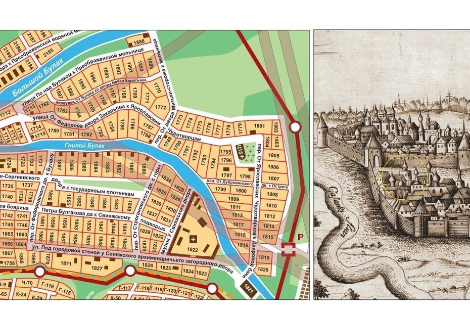 «Ну, с сегодняшним днем все ясно, а как, — спросит читатель, — определить очертания той, давно исчезнувшей улицы?» Вы удивитесь, но сделать это несложно: нужно просто глянуть на наш совмещенный план XVIII века и отыскать на нем улицу Ярославских Чудотворцев, ведущую к одноименному храму и подобно змее извивающуюся под кремлевскими стенами. Помнится, в ходе работы над «Казанским посадом» мне непросто было объяснить этот загадочный извив, теперь же, когда я детально ознакомился с данными Писцовой книги, все встало на свои места: вполне очевидно, что изогнутая самым причудливым образом линия улицы Ярославских Чудотворцев повторяет очертания береговой линии Гнилого Булака, к XVIII веку давно уже засыпанного.