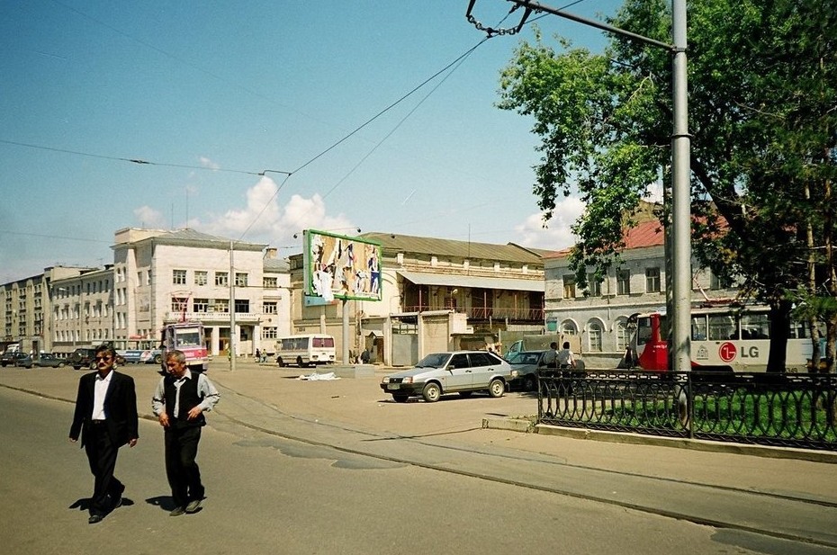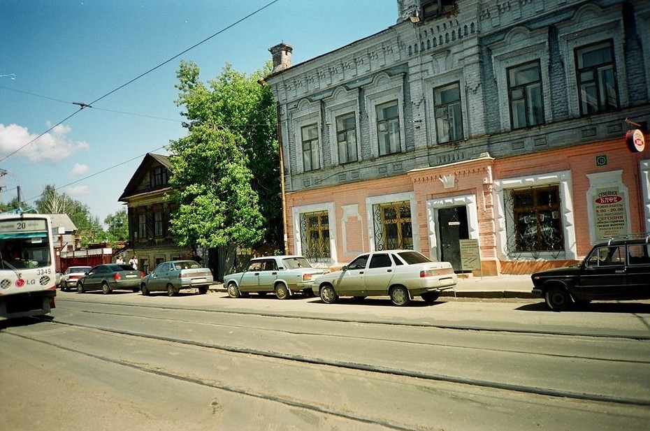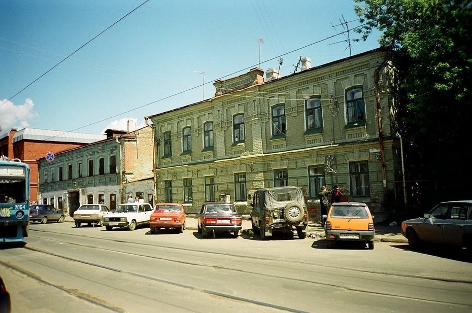 Позади растерзанного рекламного плаката — здание фуражного склада (сенохранилища) и конюшни XIX века, которое потом стало просто складом, позже еще и автомойкой и лишь затем превратилось в Центр современной культуры «Смена». В кадр попали не только трамваи, но и один из автобусов ПАЗ, которые, наряду с «Газелями», составляли часть транспортного ландшафта Казани. Их начали выводить из пассажирских перевозок после 1000-летия Казани, а окончательно большие автобусы закрепились к началу 2010-х.