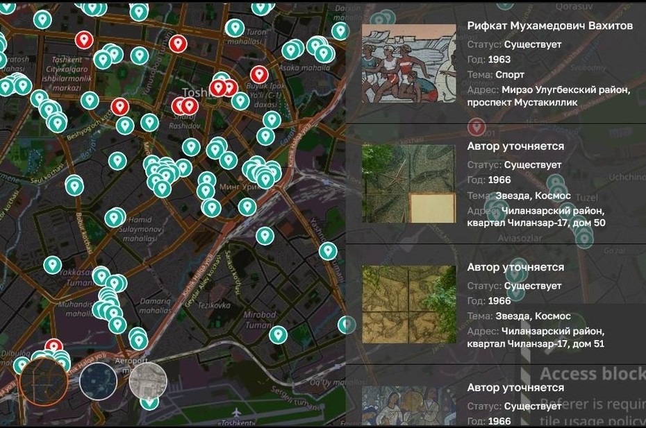 Цифру мы берем из проекта «Мозаики Ташкента», который создал департамент цифрового развития при Хокимияте Ташкента с помощью энтузиастов. Это сайт и приложение с картой, где можно изучать мозаики, ставя фильтры по художникам, годам, местоположению. Некоторые можно оживить с помощью дополненной реальности.