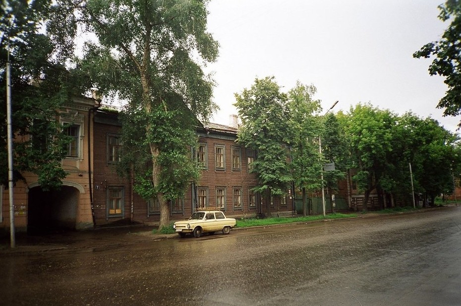 Сейчас здесь стоит кирпичная 10-этажка на 126 квартир, возведенная в 2010 году. На фото в центре — дом XIX века, его дореволюционным владельцем числится Андрей Акишин. Семейство Акишиных здесь обитало, потому что занималось изготовлением памятников для Арского кладбища. Потом в доме жила семья ветеринара Федора Караулова.