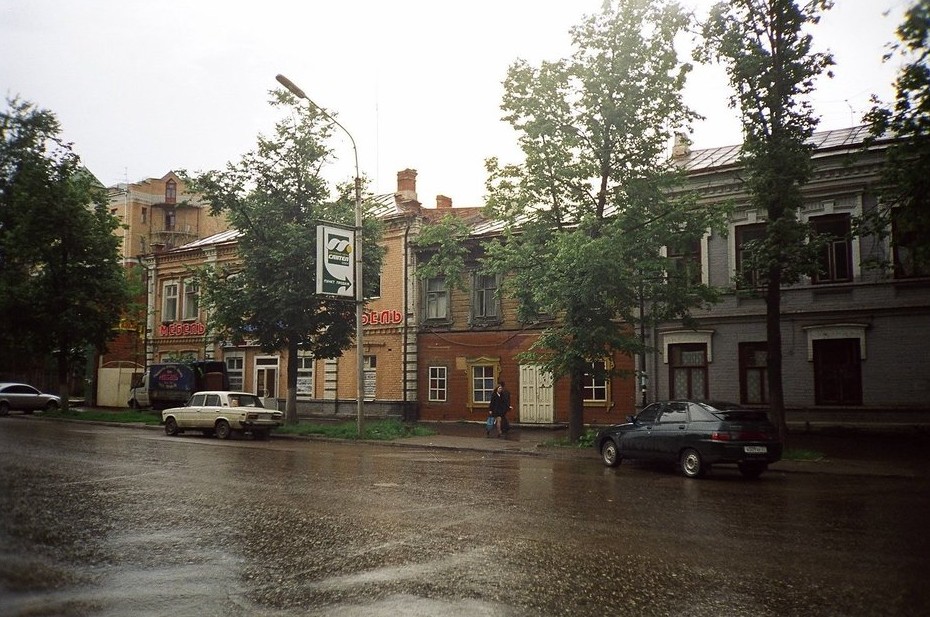 На фото можно опознать угол со Шмидта, потому что и сейчас там стоят гостиница и ресторан «Булгар». Объекты построили в 1988 году, проектировал их Хамит Сунгатуллин, главный архитектор проектов в институте «Казгражданпроект». Также Сунгатуллин занимался интерьерами в гостинице «Татарстан», общежитием студентов КФЭИ и застройкой улицы Вишневского советскими зданиями. Его увлечение — пейзажи и натюрморты, выполненные в технике акварели и пастели. В 90-е — это отельное «лакомое» место, его делили ОПГ «Перваки» с «Калугой». В 2007-м здание отремонтировали.