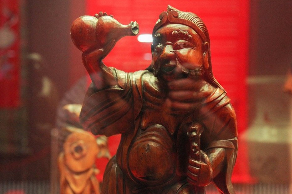 Другая ваза, из фарфора в цветной глазури, имитирует гриб линчжи. Издавна этот древесный гриб входил в состав «пилюль бессмертия», его длительное применение обещало долголетие. Еще один символ долголетия — персик, его изображения часто встречаются на разных предметах. Легенда рассказывает об одной даосской бессмертной, в саду у которой росли персики. Дерево плодоносило раз в несколько столетий или больше, тогда на пир богиня собирала равных, других бессмертных. Конечно, и обычным людям хотелось отведать заветного плода. А как это сделать, если не прокравшись тайком и не украв? Сделала это и одна обезьяна, которая впоследствии превратилась в Сюнь Укуна, царя обезьян, известного позже по роману «Путешествие на Запад» У Чэнъэня. Этот хитроумный герой есть у многих народов: остроумный Полишинель у французов, мудрый, прикинувшийся простачком Петрушка или даже отчасти Бригелла из Дель-Арте.