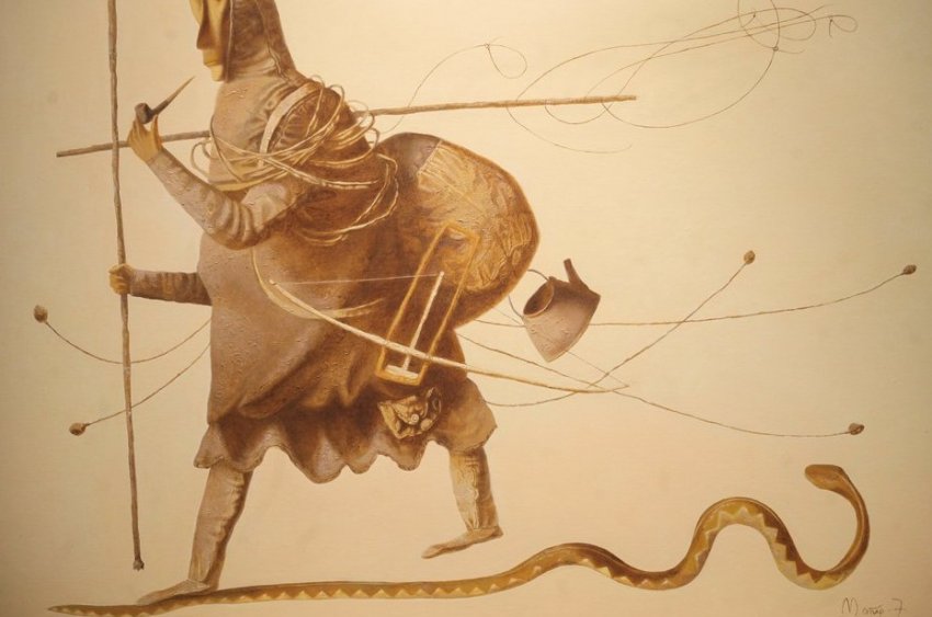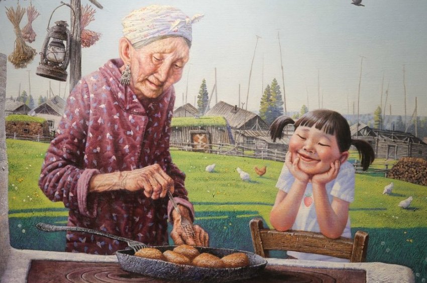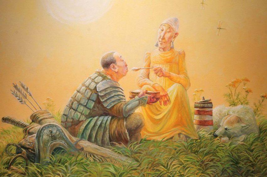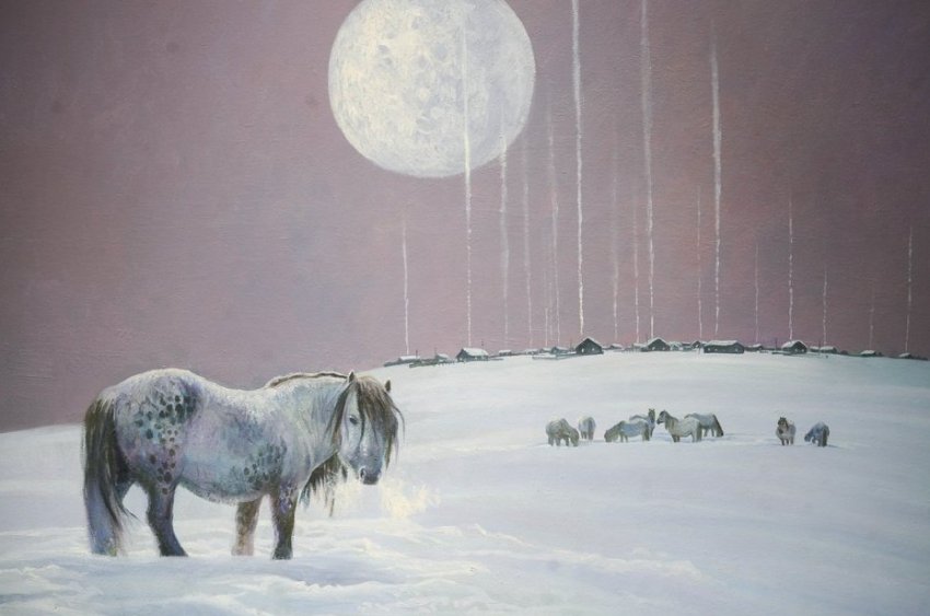 Второй зал экспозиции — это, прежде всего, картины. Михаил Старостин представлен полотном «По тропе-змейке». Художник известен своим новым взглядом на человека Арктики, кочующего по разным дорогам. Молодой живописец Иннокентий Корякин в прошлом году выставлялся на персональной выставке в столице Якутии, в Казань приехало несколько его полотен, например, «Лунная ночь» — кони в бескрайних снегах. Притягивает внимание шутливое полотно «Избалованный боотур». Толстяка, сидящего на лужочке, заботливо кормит бабулька: видно, как оба довольны жизнью. Однако следует помнить, что боотур — воин-защитник. В древних легендах Олонхо — прародитель, но слово стало нарицательным, и, по сути, это привычный нам «богатырь». Картина показывает, что бывает, если женщина начнет излишне баловать своего защитника, богатыря.